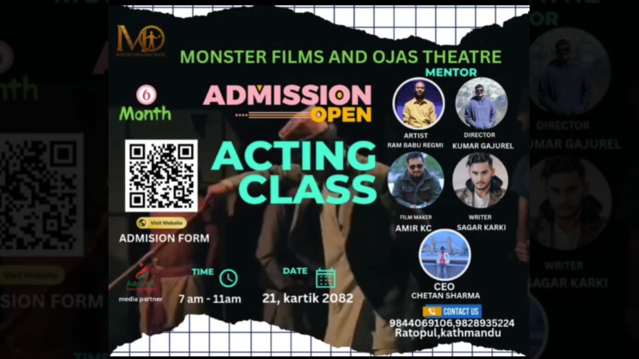 काठमाडौं ।थिएटर र फिल्म अध्ययनमा सक्रिय संस्था Monster Films and Ojas Theatre ले ६ महिनाको ‘थिएटर अभिनय र फिल्म अभिनय कोर्स’ का लागि भर्ना खुला गरेको छ।